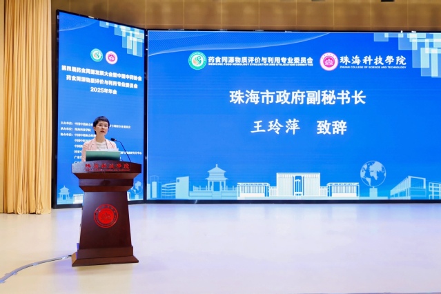 珠海市政府副秘书长王玲萍代表珠海市人民政府致辞,首先向陈君石院士、谢明勇院士及参会专家、企业家致以敬意与欢迎,感谢珠海科技学院高效筹备保障大会举办。王副秘书长指出珠海依托粤港澳大湾区区位优势,正加速成为药食同源产业创新高地,2024年相关产业产值达180亿元,培育润康药业、丽珠制药等骨干企业,建成15个研发中心、8个生产基地,形成涵盖三大类近200个品种的产业集群。珠海还出台专项政策,对药食同源国家级科研项目最高配套100万元,新建省级以上检测平台奖励150万元,并借横琴粤澳深度合作区优势推动跨境产业协同与标准互认。她强调,珠海科技学院通过建设专精特新产业学院、国家中药现代化工程技术中心药食同源与健康研究分中心,近五年获174项各级科研项目、2.7亿元经费,为产业提供关键支撑。珠海将持续优化环境,期待以大会为契机深化合作,打造全国领先的药食同源产业创新高地。