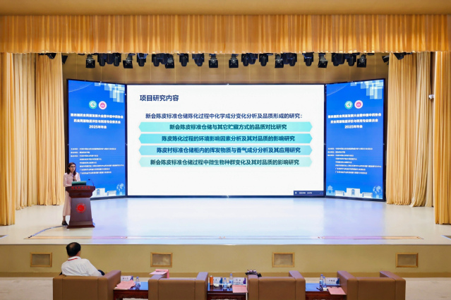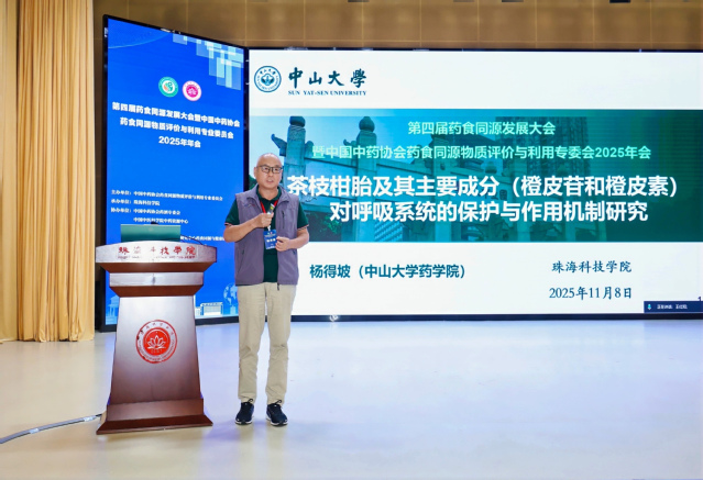 中山大学杨得坡教授分享广陈皮相关研究,重点介绍茶枝柑胎提取物的制备工艺与产品开发,证实陈皮苷、橙皮素等成分具有显著止咳化痰功效,为相关产业创新提供科学支撑。