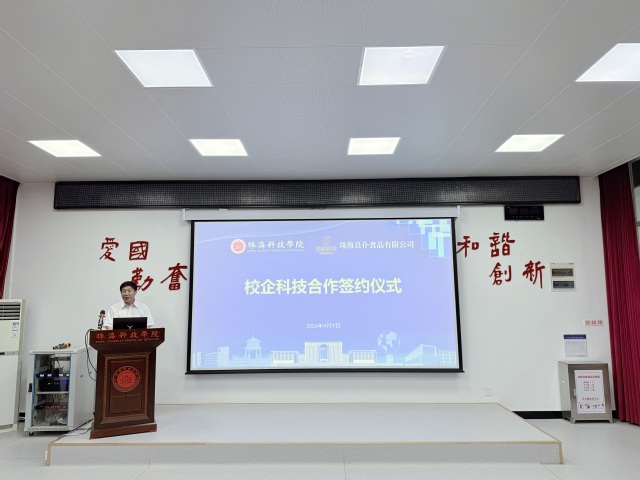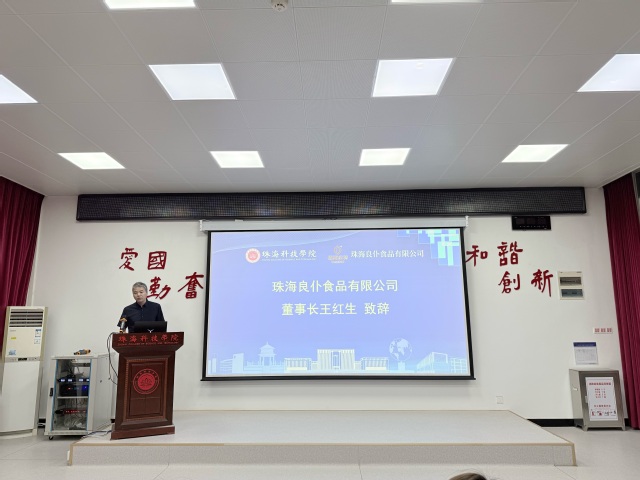 珠海良仆食品有限公司董事长王红生在致辞中表示,在2年多的产学研基地共建的基础上,此次科技合作从企业提出发展计划、研究团队拿出实施方案,直到今天合作项目成功签约,仅仅用了2个月的时间,他对珠海科技学院研究团队的高效率工作给予充分肯定。在致辞中他介绍了珠海良仆食品有限公司作为高端休闲食品领域的深耕者,始终坚守品质初心,以创新驱动产品升级,持续探索健康、营养、差异化的研发方向。他表示,此次合作是学校科研优势与企业市场经验的深度绑定,双方将以“企业命题、学校答题”为纽带,发挥企业市场洞察与技术痛点识别能力,打造更贴近市场需求、更具竞争力的优质产品,推动产学研深度融合,实现共赢发展。