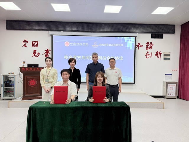 生命科学学院党委书记、院长胡文忠与珠海良仆食品有限公司总经理张春燕共同签署校企科技合作协议