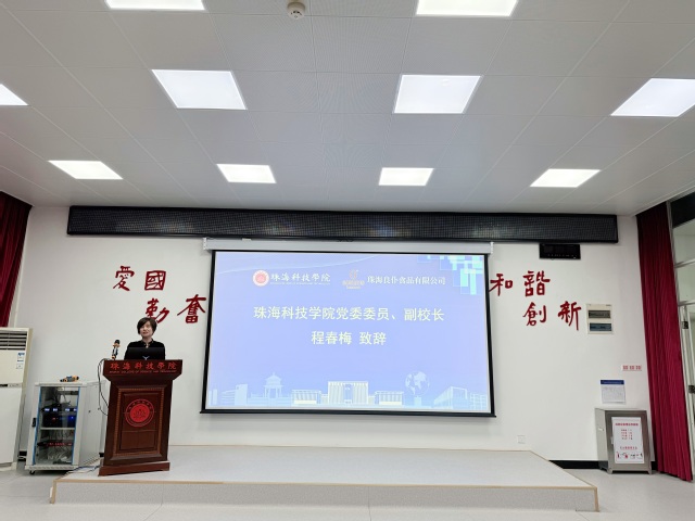 学校党委委员、副校长程春梅在致辞中代表学校向王红生董事长、张春燕总经理一行表示热烈欢迎,向为促成合作付出辛勤努力的胡文忠院长团队表示衷心感谢。她介绍了学校的发展历程与办学成就,并指出学校始终坚持以服务地方经济社会发展为己任,高度重视产教融合、科教融汇。她表示,此次合作不仅是技术研发层面的携手,更是应用型人才培养模式的创新探索——通过搭建校企合作育人平台,让学生参与从原料分析到产品开发的全过程,实现“真题真做”,切实提升实践能力和创新精神。同时,她也期待合作成果助力珠海良仆食品有限公司打造具有核心竞争力的天然食品系列,提升品牌科技含量与市场价值。